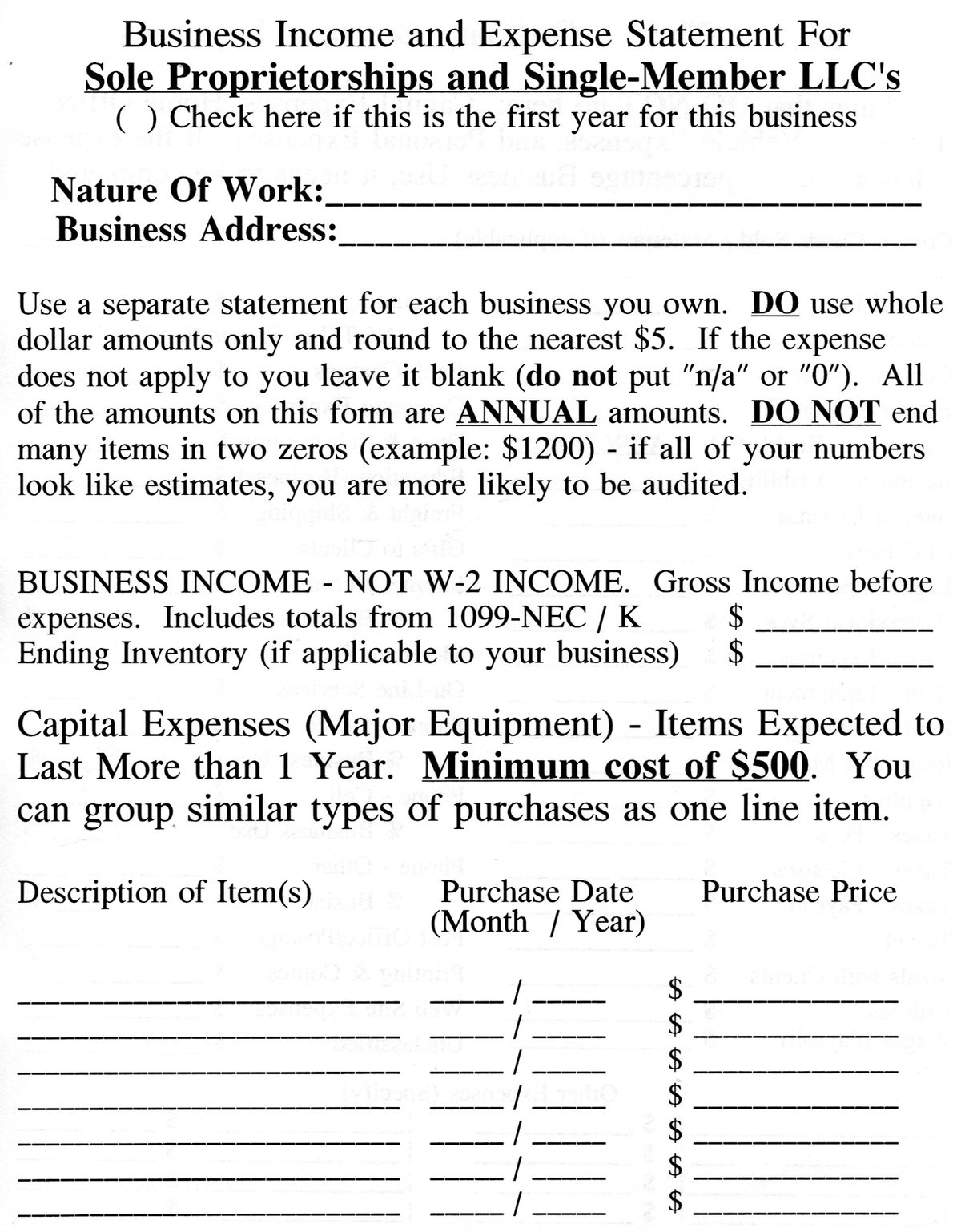 So here they are. Please read the instructions and fill out these forms as completely as possible. Use whole dollar amounts rounded to the nearest $5 (for example - $65, not $63.47). Do not end too many in "00" (for example - $1200) - it will look estimated and fake. Always use annual amounts, do not put down "$40 / month". I have no idea how many months you had that expense for. And the answer is always a number, never the phrase "the same as last year". Using identical numbers year-to-year is another audit risk. Don't do it.