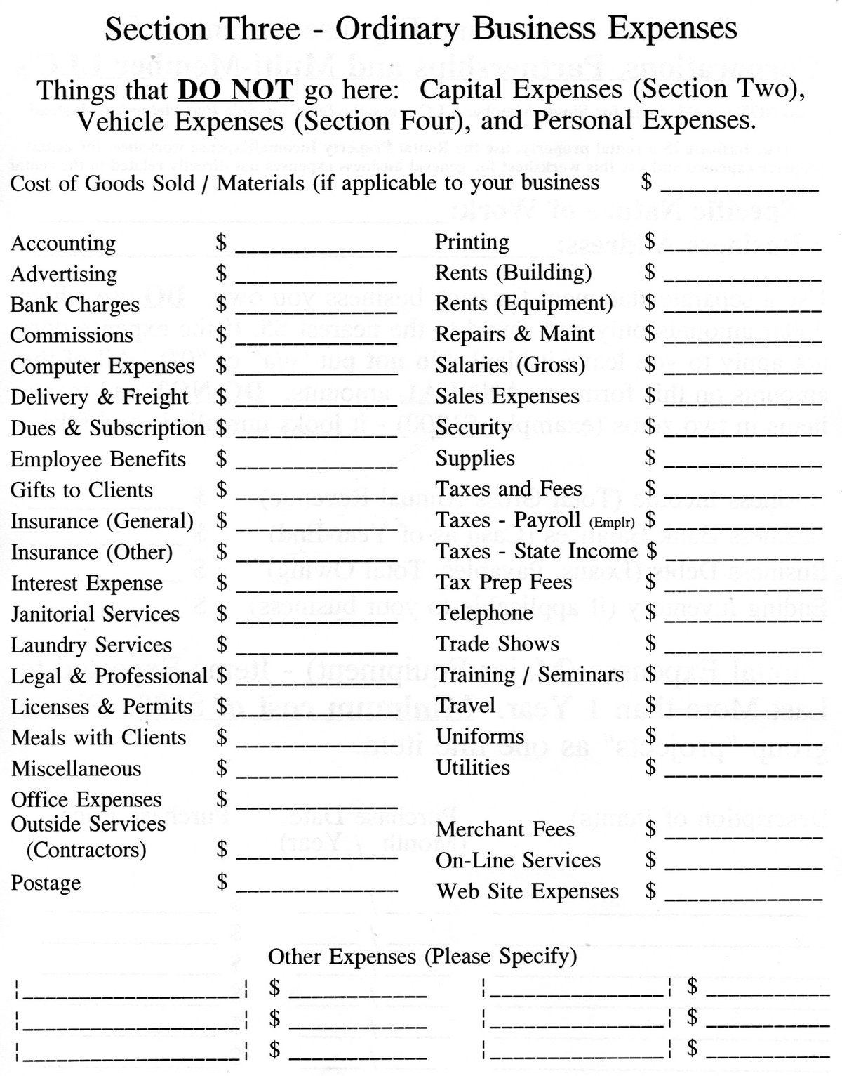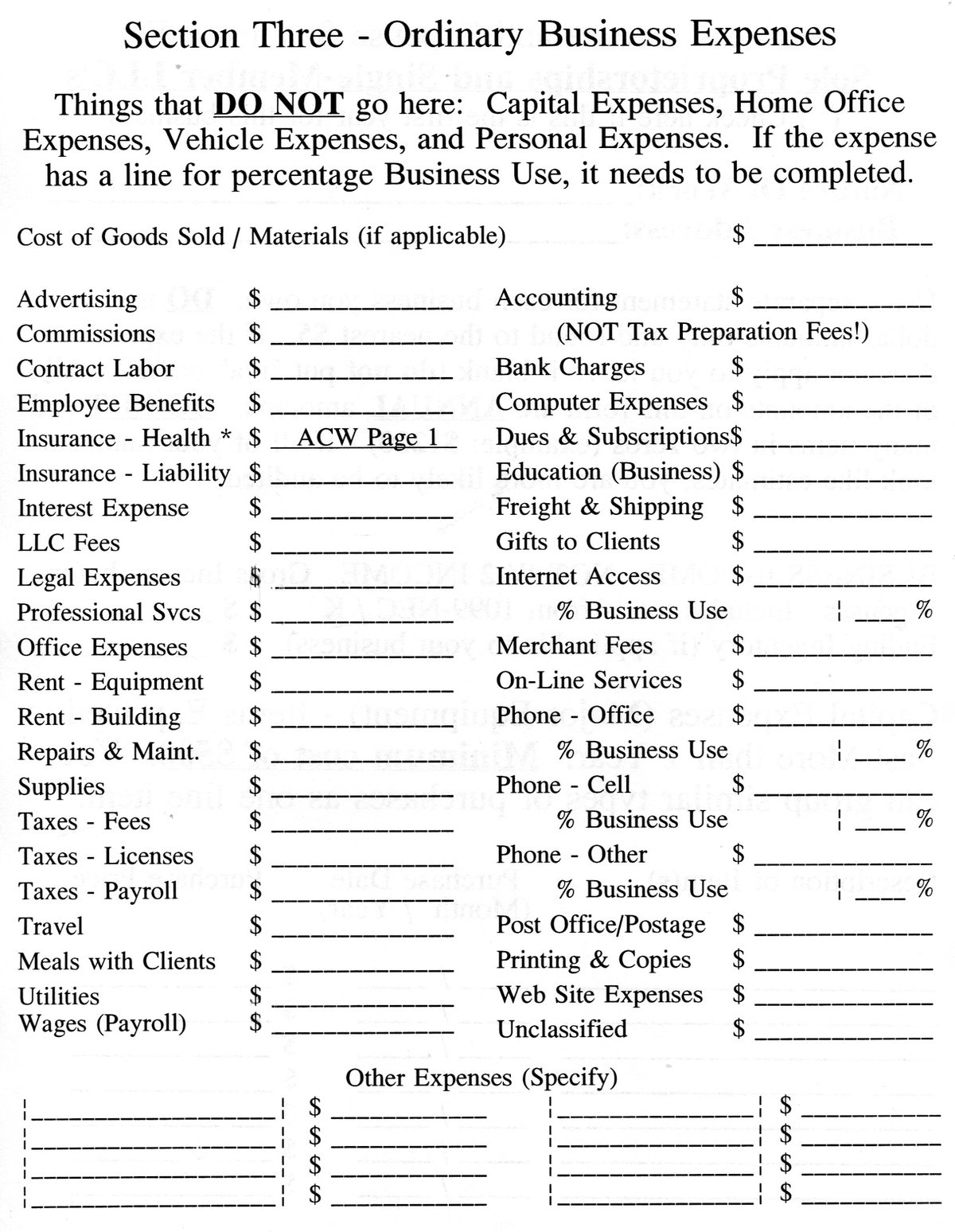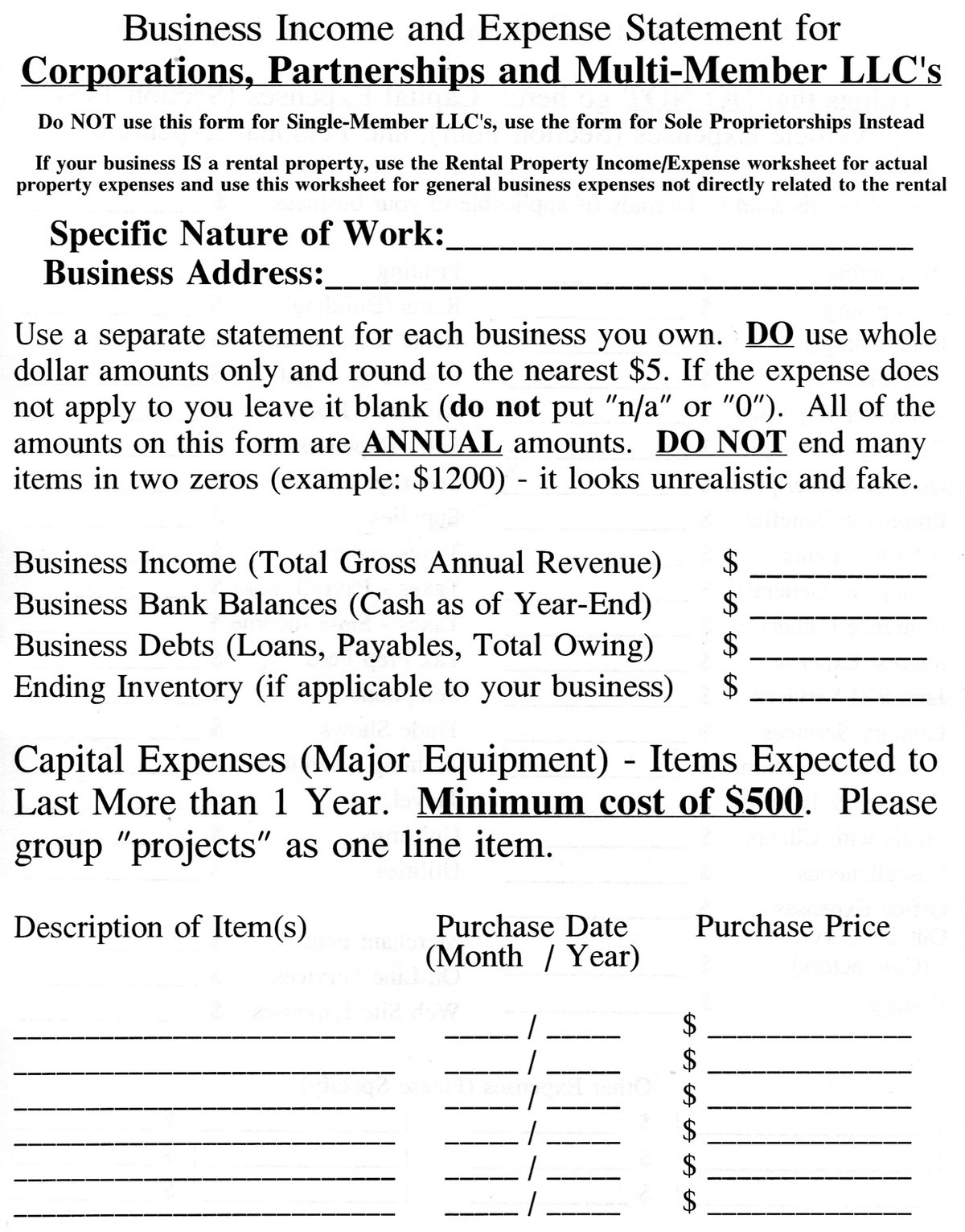 So here they are. Please read the instructions and fill out these forms as completely as possible. Use whole dollar amounts rounded to the nearest $5 (for example - $65, not $63.47). Do not end too many in "00" (for example - $1200) - it will look estimated and fake. Always use annual amounts, do not put down "$40 / month". I have no idea how many months you had that expense for. And the answer is always a number, never the phrase "the same as last year". Using identical numbers year-to-year is another audit risk. Don't do it.